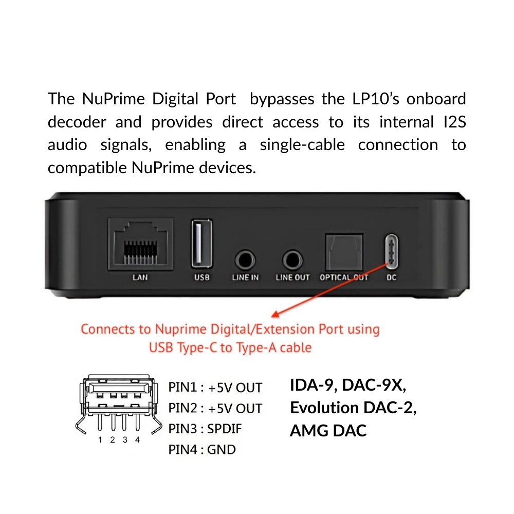 The LP10 NuPrime Edition is a high-performance wireless music streamer that supports a wide range of streaming options, including AirPlay 2, Google Cast, and network DLNA. It enables seamless wireless music control and multiroom playback. The LP10 offers both analog input and output, and high-resolution digital outputs. Unlike standard LP10 model, the NuPrime Edition integrates a proprietary NuPrime Digital Port, offering direct access to internal I2S audio signals. This design bypasses the LP10’s onboard decoder, allowing a single-wire connection to compatible NuPrime devices, delivering both digital audio data and DC power through one cable for simplified, low-noise system integration.